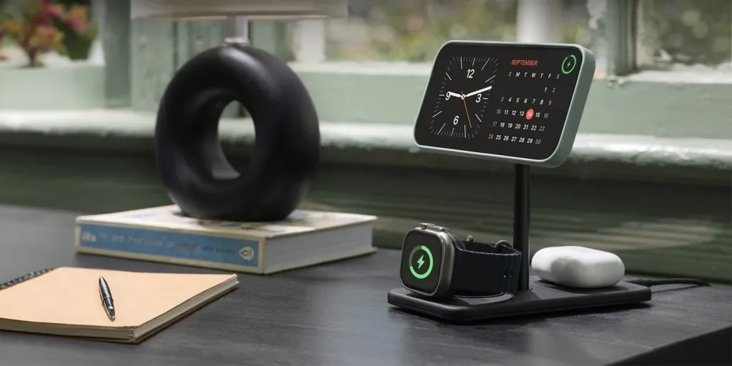 これは3-in-1のセットアップで、iPhone用の公式15W MagSafe充電器、AirPodsやその他のQi対応デバイス用の7.5W Qi認証充電器(ベースに搭載)、そしてApple Watch用のマグネット式急速充電器が付属しています。メインパッドは調整可能で、ビデオチャットに最適な角度にスマートフォンを固定できます。この製品は非常に気に入っています。重量感のある安定感のある作りで、ベース部分はヴィーガンレザーで覆われ、洗練されたアルミニウムのアクセントがアクセントになっています。